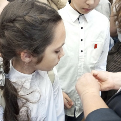 Муниципальный координатор Движения Первых в Верхнемамонском районе Ольга Викторовна Ковригина зачитала символическую клятву, а Наставники прикололи ребятам значки Движения Первых.